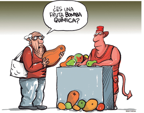Le gustan tanto, que hace mil maromas con la escasa pensión que recibe para comprarse algún sabroso ejemplar de esta última. Pero de nada le vale el sacrificio, porque algo, quizás peor que la estrechez de dinero, viene a echar su sueño por tierra: las frutabombas han sido puestas a madurar de manera forzada y venenosa, bajo el efecto del ethephon, un compuesto orgánico fosforado que acelera la maduración del producto.