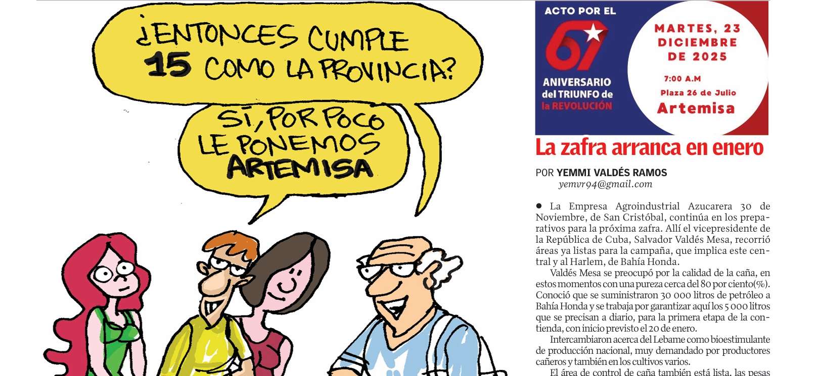 La edición 49 de el artemiseño nos recibe con la noticia de que la Empresa Agroindustrial Azucarera 30 de Noviembre, de San Cristóbal, continúa en los preparativos para la próxima zafra.