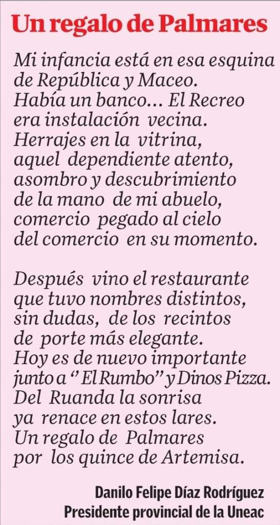 Cuando el Ruanda en fecha próxima y aún no definida, reabra sus puertas al público, todos agradeceremos a Palmares por devolvernos ese espacio, vital y confortable; justo cuando la provincia está llegando a sus 15 eneros, más bonita, elegante y emprendedora.