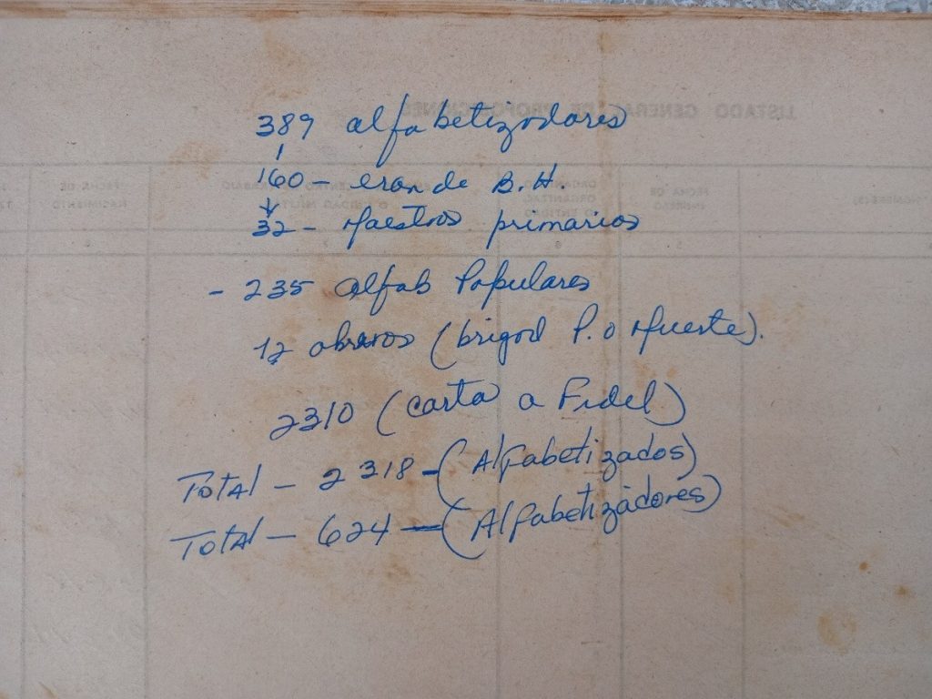 De los pobladores de Bahía Honda, 3 850 eran analfabetos, 3 467 eran aptos para la enseñanza y 3 465 fueron alfabetizados, lo que representa un 90.52% del total. (Foto: Notas de Juan Albert, estadista del consejo; cortesía del museo local).