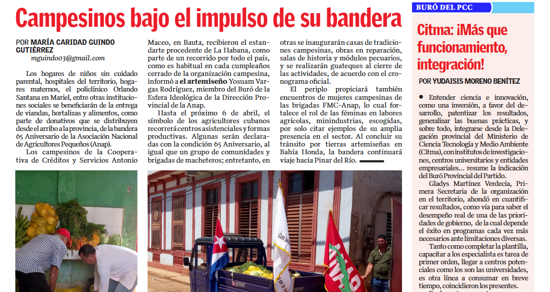 Nos recibe la edición 12 de este semanario con el impulso de cada campesino para beneficiar a hogares de niños sin cuidado parental, hospitales del territorio, hogares maternos, el policlínico Orlando Santana en Mariel, entre otras instituciones sociales con la entrega de hortalizas y alimentos, como parte de donativos que se distribuyen desde el arribo a la provincia, de la bandera 65 Aniversario de la Asociación Nacional de Agricultores Pequeños (Anap).