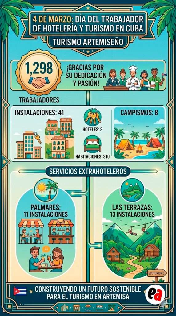 En el Día del Trabajador de la Hotelería y el Turismo, Artemisa congratula a los 1 298 trabajadores que, en 41 instalaciones, ofertan productos y servicios para el esparcimiento de clientes nacionales e internacionales que visitan la provincia en búsqueda del contacto con la cultura, la historia y la naturaleza, que ofrece gustosamente este pedazo de la geografía cubana.