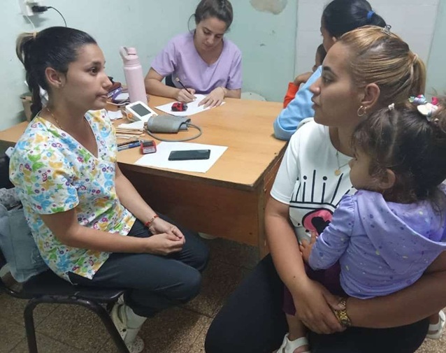 Al llegar a la consulta del policlínico No. 1 de San Antonio de los Baños, las encontré de guardia, en plena faena. Madres con niños escuchaban atentas las recomendaciones y el proceso a seguir después de auscultar a los pequeños y visualizar los exámenes clínicos.